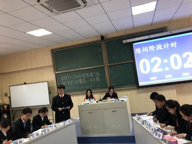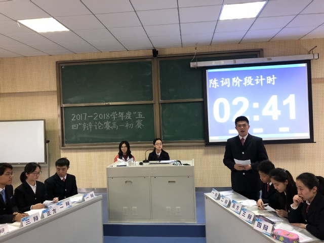 2018年3月19日下午三点至五点,E楼的二、三层阶梯教室迸射着思维碰撞现场的耀眼火花——一年一度的“五四”辩论赛高一年级初赛正在如火如荼地进行,高一年级全部八个班组建成的八个代表队之间展开了四场口舌与脑力的角逐。