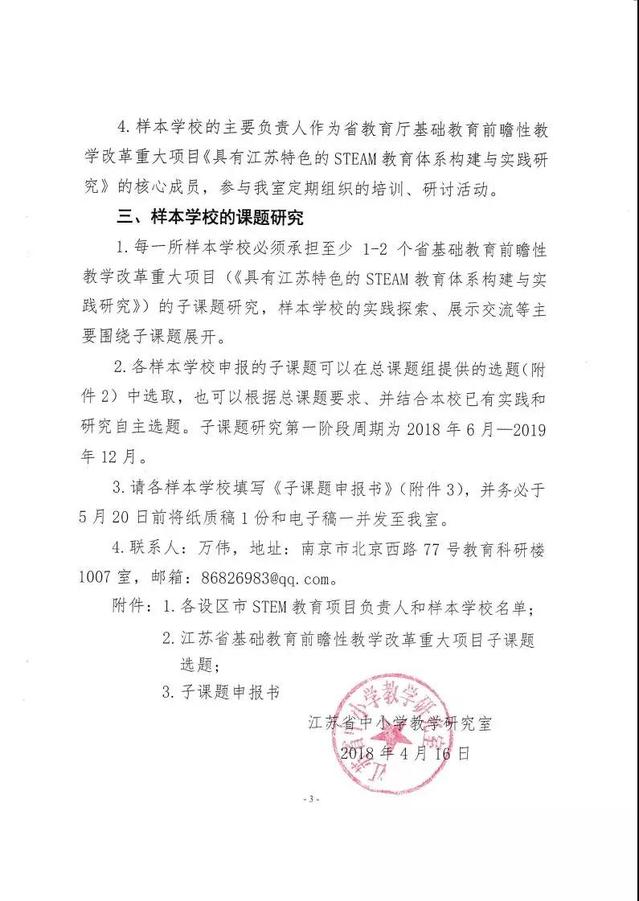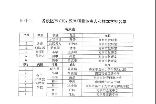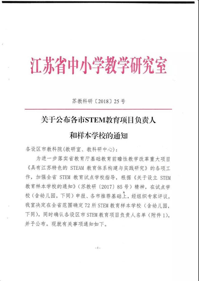 近日,江苏省中小学教学研究室正式发布了关于公布各市STEM教育项目负责人和样本学校的通知,beat365被列为省STEM样本学校,朱征副校长被列为STEM教育项目负责人。