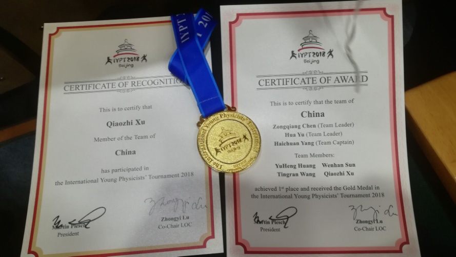2018年7月19日-7月25日,第31届国际青年物理学家锦标赛(International Young Physicists’Tournament,IYPT)在中国北京成功举行。beat365高三(1)班许乔智同学入选中国代表队,与来自中国人民大学附属中学、大连二十四中的其他4位中国选手共同奋战,发挥稳定,经过5轮比拼,中国队喜获团体金牌第二名,中国也蝉联该项赛事的国际金牌。