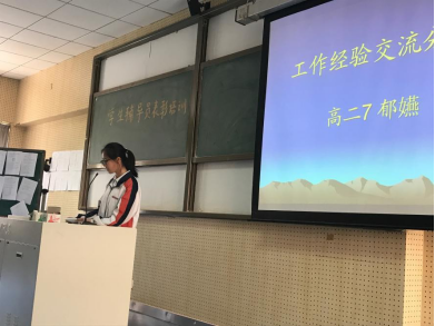 表彰颁奖后,来自高二(7)班的郁嬿同学作为优秀学生辅导员代表与新一届学生辅导员们交流了自己的经验。