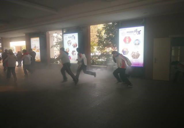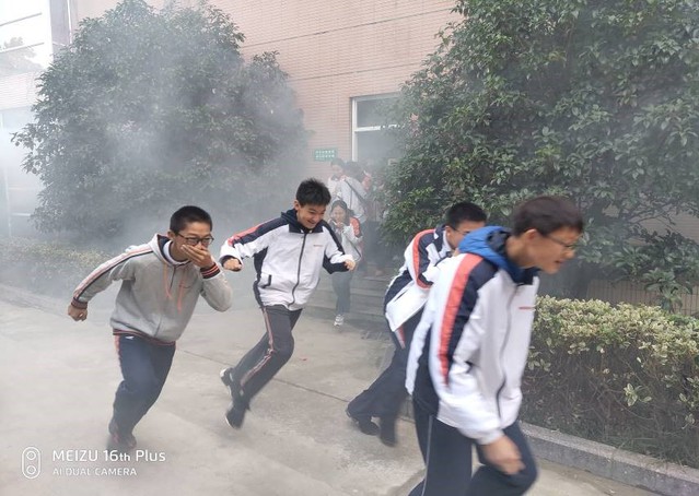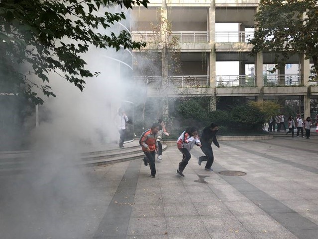为了使效果更逼真,让此次消防演练达到更好的指导作用,学校还特地安排了烟雾喷射的环节。走廊上不断有带着难闻刺鼻气味的浓烟冒出,我们不得不捂住口鼻弓着背低身行走。一路上,不少同学还拿着沾湿的毛巾捂在脸上,以防吸入“有害气体”。