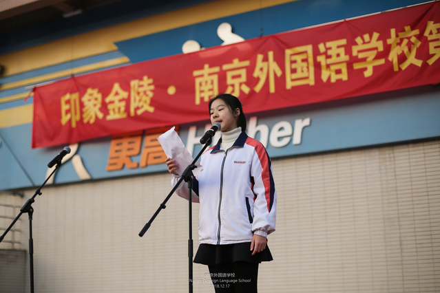 B:本次艺术节的主题为“印象金陵”。艺术节期间,声乐,器乐,舞蹈比赛中有你们的身姿,书法、手工制作大赛有你们的创造力和想象力,大家用丰富的艺术表现形式表达对家乡南京的印象与热爱。我们来听一听初二12班的顾楚瑜是怎么理解这个主题的。