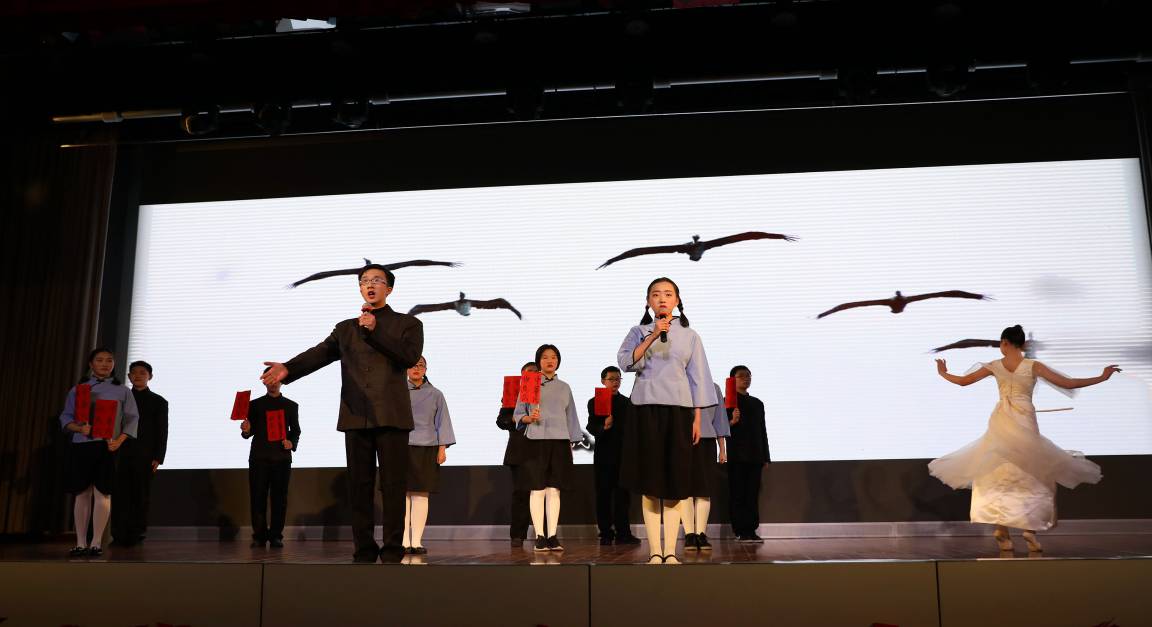 初二(12)班的情景剧《让历史告诉未来》,构思巧妙、服装多彩、场景丰富,同学们的朗诵与表演抑扬顿挫、声情并茂。