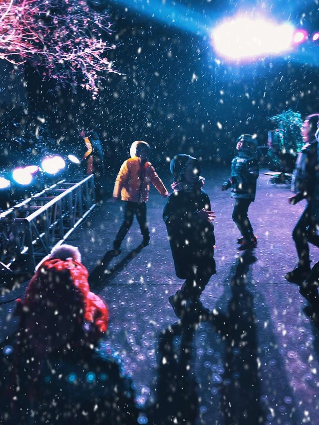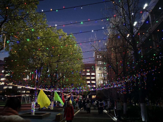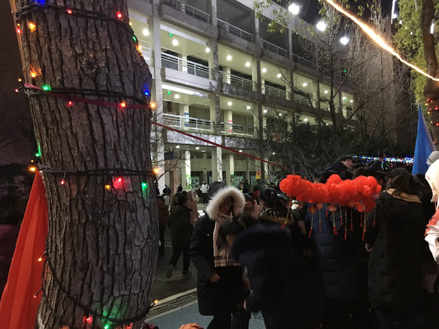不同于去年的是,今年没有了篝火。为了让学生体验冬天新年的快乐,学校特意为大家下了场雪。