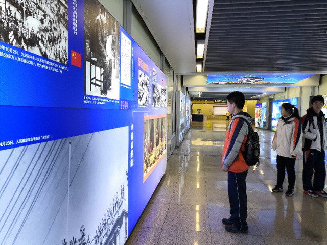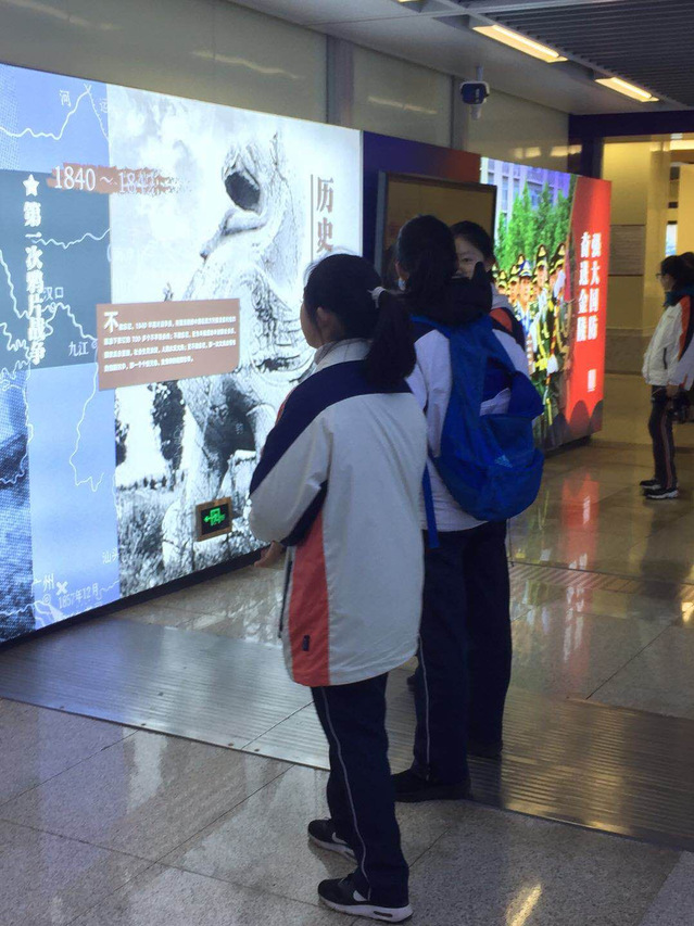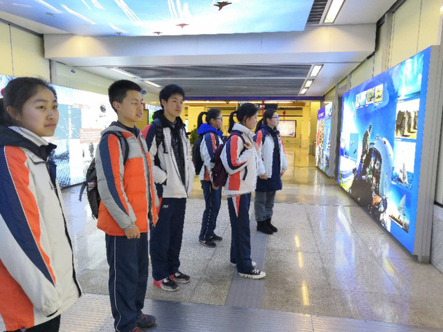 常规训练结束后,国旗班成员集体参观了位于4号线岗子村站的国防教育地铁站。地铁通道两侧及天花板上都布设了内容丰富的国防教育主题图文展览,一幅幅图片浓缩了人民军队91年来的光辉历程,在声光电立体展示效果的带动下,同学们进一步增强了“爱我国防爱我军”的情怀和强国强军的意识。