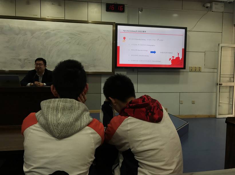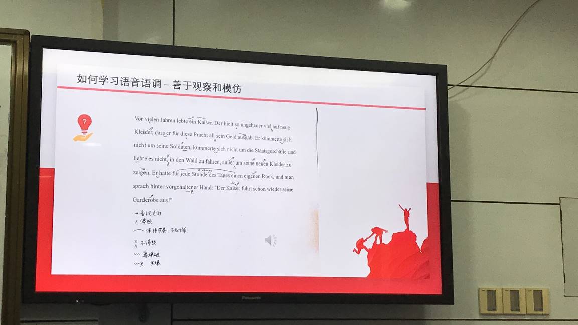 王老师深入浅出的讲解让同学们深受启发,其现场的配音更是让同学们拍案叫绝,掌声雷动。不论是奔驰广告,还是诗歌、童话,王老师都能演绎的惟妙惟肖,大家不禁感叹原来德语也可以拥有这样的韵律之美!在最后现场朗读德语新闻环节,同学们纷纷积极参与,都希望抓住王老师现场点评的好机会。