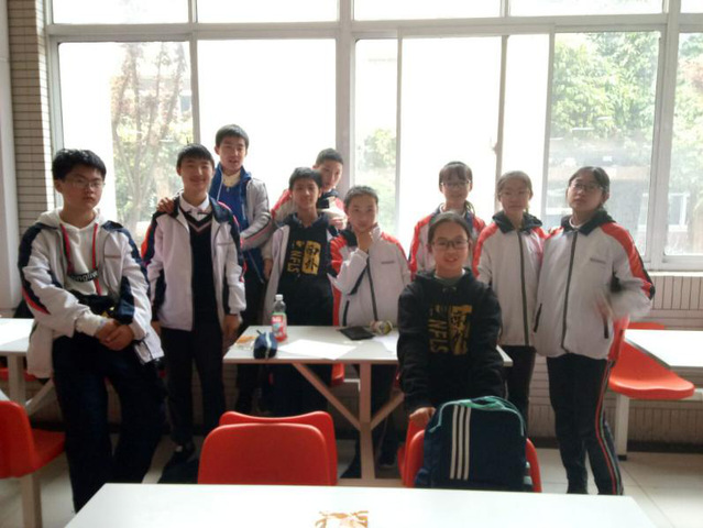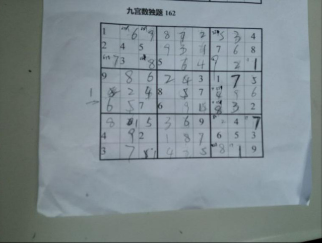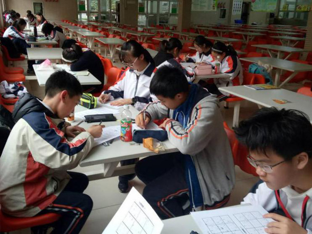 刚刚开始大家的状态还是不错的,时常有“呀,有填出来一个”的声音。对数独颇为擅长的徐昊阳同学,势如破竹,时不时还和周围的同学说两句玩笑,周围同学也不时报以幽默的回应,食堂里充满轻松融洽的气氛。但很快事情出现了转折,大家仿佛都在同一时间卡住了,一下子鸦雀无声,所有人都寻找着突破口,徐昊阳开始了假设,有人在数独上写几笔,又擦掉,写几笔,又擦掉,始终没有确定下一个数。虽然谁都愿意独自作出一道数独来证明自己的实力,但当看似无望时,大家很快脱离了单干,都三三两两聚在一起抱团取暖,为的是自己组能做出一个,成为第一名。时间一分一秒的过去,有些人感到不耐烦了,趴在了桌子上似乎放弃了,那些几个人做一份的呢,互相鼓励,不断地填出一个又一个。但所有人都开玩笑地说,等郭一涵回来了,一定要和他理论理论,因为他准备的题目让同学们吃尽了苦头。