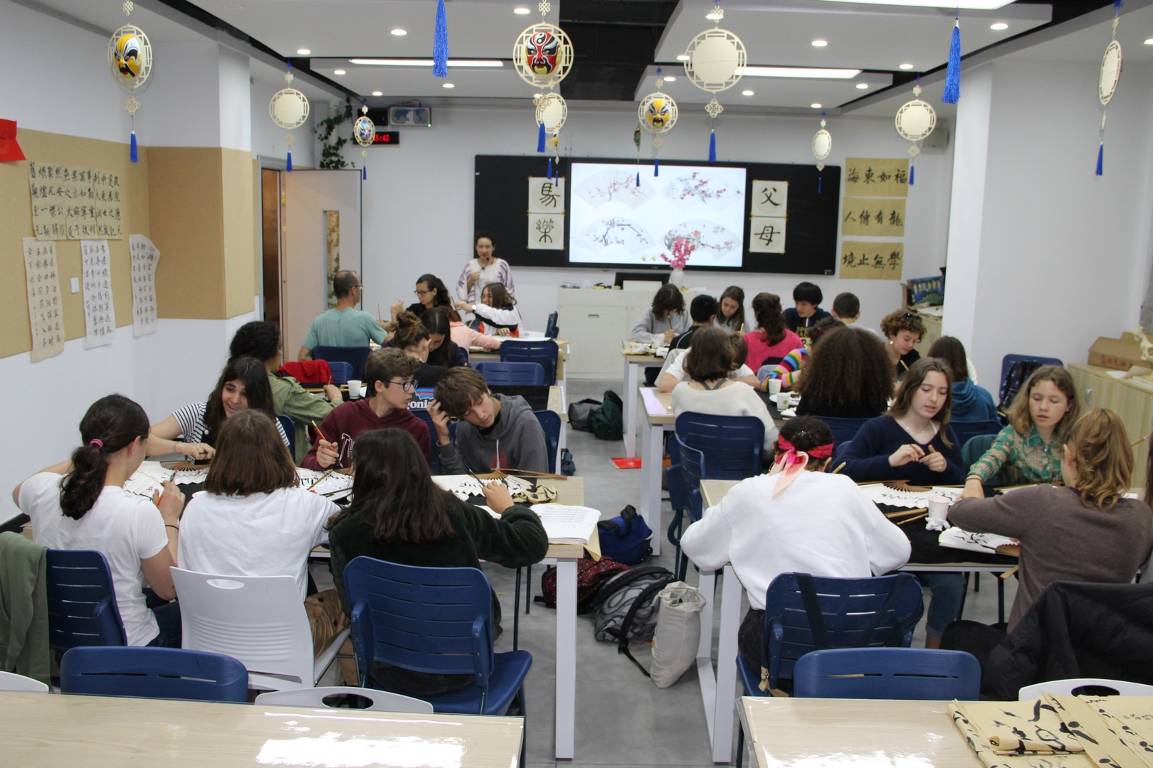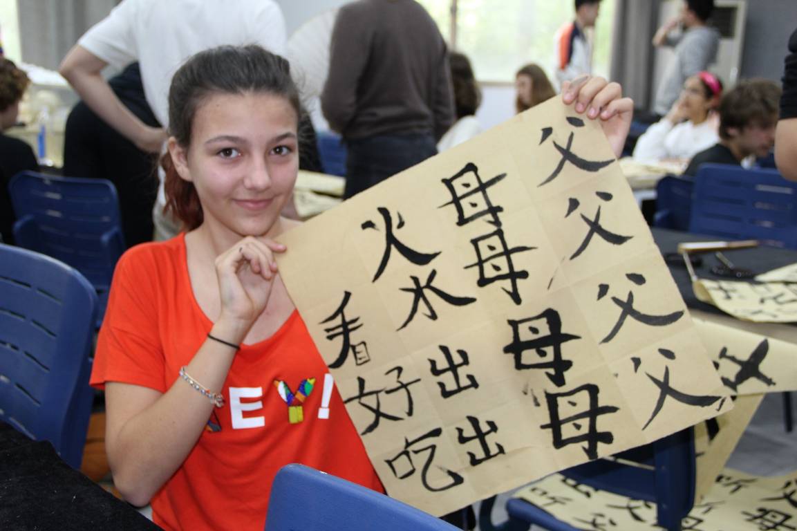 4月9日,法国学生进入陈明洁老师的书法课,用隶书和楷书书写中国文字,方块字中自有天地,一撇一捺之中尽显分寸。在镜头前,法国学生骄傲地举起了自己的大作。