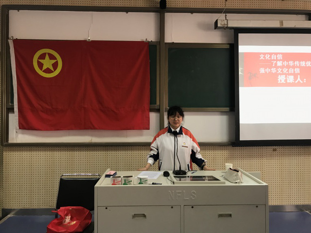 最后两天分别由两位校团委委员戴逸清和韩冰仪同学主讲。两位同学所讲的课程是爱国主义教育和中华传统文化教育。戴逸清同学主要向同学们介绍近年来我国发展取得的主要成就、认识“中国梦”,引导同学们树立民族自尊心、自信心和自豪感;韩冰仪同学则以筷子为切入点,重点介绍我国传统文化,希望同学们能够增强文化自信,自觉承担传承中华优秀传统文化的责任。