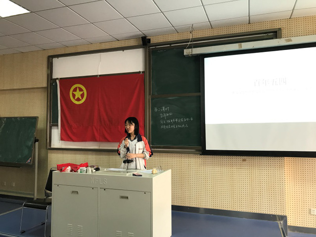 第二天的课程由校团委委员孙雨筠主讲。她向同学们介绍了五四运动的历史,带领同学们重温五四精神。向同学们讲解习近平总书记对青少年的寄语和要求,学习习近平总书记在纪念五四运动100周年大会上的讲话,引导同学们要听党话,跟党走。