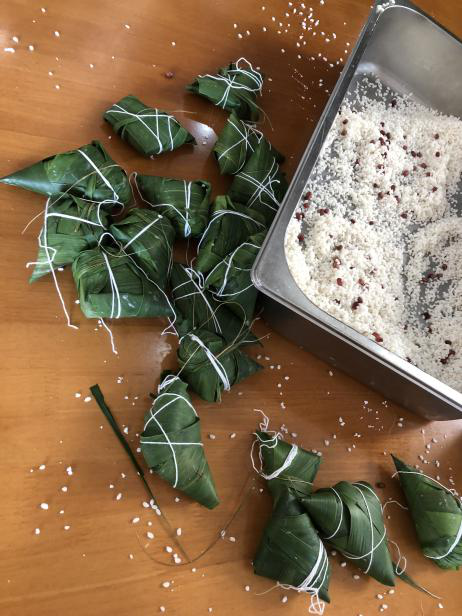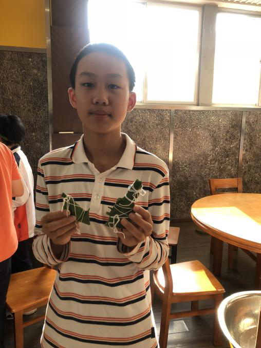 大家先按分好的小组落座,每组桌子上摆放着一摞粽叶,一盆糯米,少许红豆以及一小捆绵线。先用双手将粽叶对折卷成圆锥形,再倒入米,顶口留大约5毫米的空隙,再将粽叶完全压住开口,向一侧紧紧包住,再调整粽叶包裹的方法,确保糯米不会漏出,最后在握紧包裹好的粽子外面用棉绳进行捆扎,让粽叶不会散开,米不会从缝隙掉落,最后打上一个活结就大功告成了。同学们忙的那是一个不亦乐乎,一时间场上充满了快乐的气息:同学们互相往来,互帮互助。不一会儿,几个桌子上都堆满了粽子。女同学们还不忘美观,闲暇之余还用粽叶编成了首饰,做成了头带。有的男同学们直接放弃了挑战这项过于复杂的任务,在一旁用粽叶玩起了游戏。忙碌过后,大家都十分劳累,但看着自己包的粽子,大家眼中都闪出了高兴的神采。