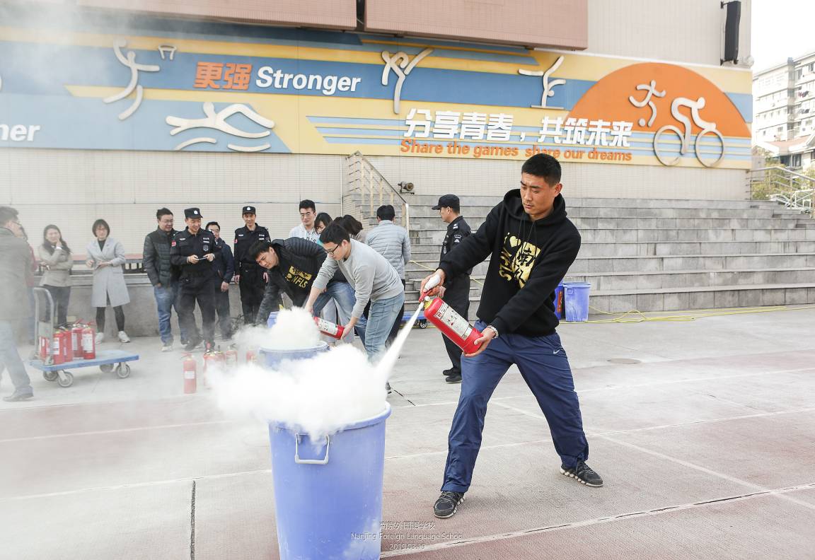 队员们在手把手教学生使用灭火器
