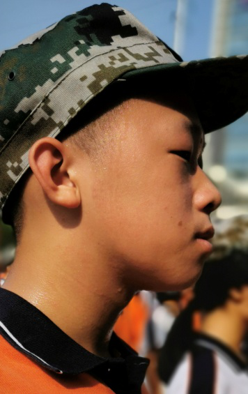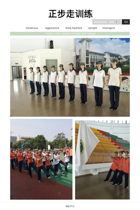 上午,教官们利用扑克牌为我们一个一个纠正军姿——经过了三天的磨练,同学们即使在骄阳下,也能慢慢静下心来。正步的教学继而在烈日下的操场上进行。“稳住!脚尖抬至前面同学的膝盖处!”操场上回荡着教官嘶哑的指导声,每个连队都在渐趋整齐的正步中大声吼出了自己的口号,吼出了自己的风采。此时手语班、示范班和国旗班,也在单独排练,为最后的汇报表演做准备。