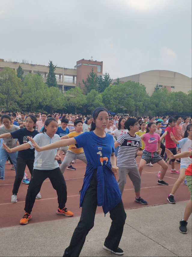 上午半天先是在史秀成老师和谢亚雄老师的带领下在复习昨天内容的基础上继续进行健功拳的学习,体育组的其他老师们则走入队伍面对面地去指导学生的动作做得更到位。并且一批做操优秀的同学被选拔出来在午间进行特训,他们将成为光荣的领操员。