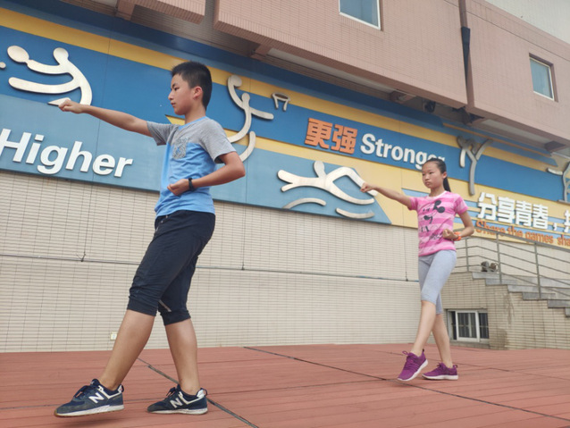 然后在如火的骄阳下再次奔赴绿茵场,进行健功拳的练习。这一次,领操员已经不再是学长,而是我们自己的代表啦!一遍又一遍,老师更加注重整体的协调,不断鼓励同学们打出精神、打出气势,同学们回应的是更加响亮的“哈“,更加有力的动作,可谓”龙腾虎跃“!远望气势如虹。
