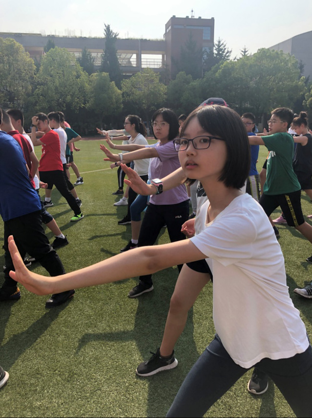 今天的训练重点是健功拳。弓步冲拳,要弓步稳如钟,冲拳利如风;马步横打,要重心下移,稳定有力……学长们一招招示范,同学们用心模仿。一开始还有些歪歪倒倒,绵软无力,练习几遍之后就有模有样的了。要说军训真的很神奇,短短一两天内,就让善于刷题的学霸们摇身一变,成了矫健有力的小战士。男同学斗志昂扬,女同学英姿煞爽。齐步走、正步走、解散、集合、军体拳……大家的每一个动作都尽可能规范到位,整齐划一,连严格的教官也点头称赞。
