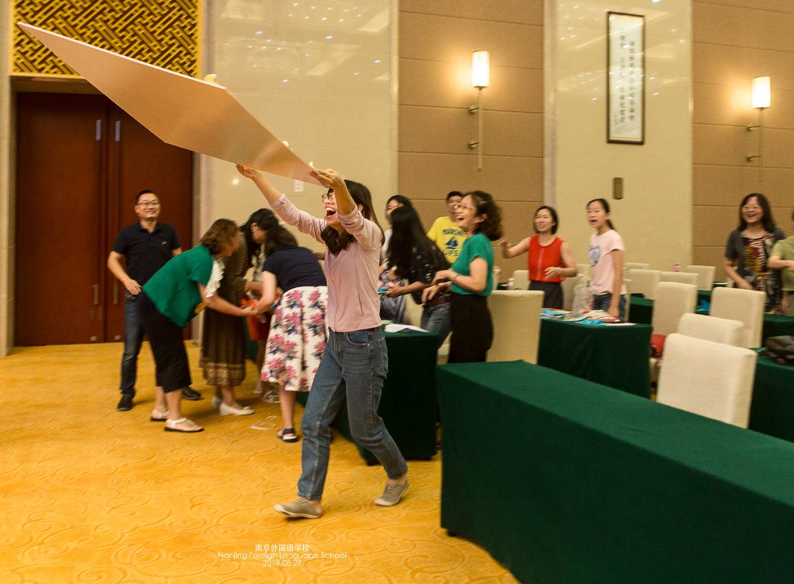激情穿越70年,这是考验各位老师手眼协调能力的项目。每个工会组选出10人,现场自制纸飞机、投掷纸飞机,要求飞机穿过70周年花环,规定时间内穿过花环的飞机数量多的小组获胜。赛前,参赛队伍认真研究如何让纸飞机飞得更远更直;比赛过程中,各参赛队伍更是铆足力气,力求百发百中。