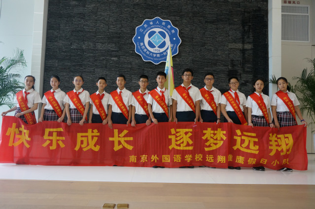 南外远翔雏鹰假日小队队员在江苏省人民医院院徽前合影
