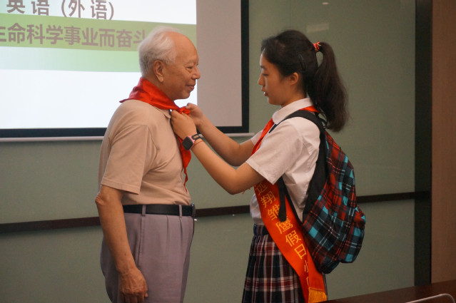 杭姜彤同学代表小队为陈家伟爷爷戴上了红领巾