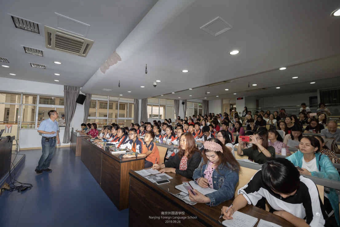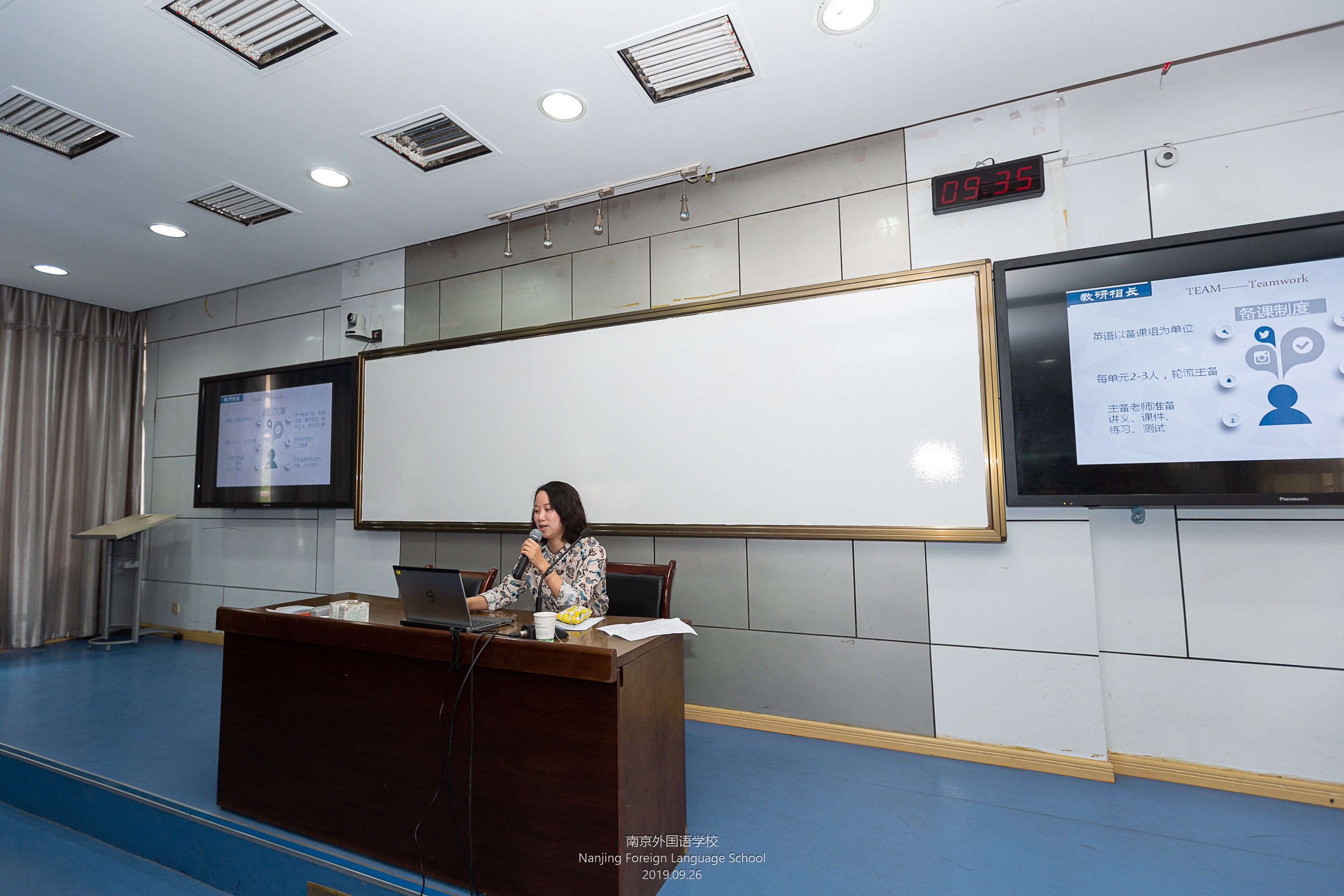 初中英语教研组长朱琳老师做了“学习型英语教研组构建”的主题讲座。朱老师的讲座由“南外初中英语教研组的人员组成”、“教研相长”、“交流学习”和“教研之外”四部分组成。朱老师首先从整体上介绍了教研组的常规工作,主要包括开学初召开教研组大会布置新学期工作,教研组长和备课组长商讨制定新学期教学计划、组织命题与考试质量分析、了解组内老师的教学教研情况;学期末开展教学研讨会,商讨下学期各项活动计划等等。教研组工作事无巨细,每一项都不可或缺。朱老师反复强调we are the team,她将“team”分解成teamwork, efforts, action和motivation四个单词,巧妙概况了英语教研组的特点。她说,作为一个团队,南外英语教研组无时无刻不体现出团队精神,特别表现在办校至今坚持的集体备课制度方面,并展示了老师们集体开发的EIM新教材教学成果,即配套的教材练习册、语法练习册和语音模仿册等。朱老师随后介绍了教研组的试卷命题制度,每一次试卷都由老师们分工独立命题,坚持原创,反复磨卷、探讨后再定稿,充分体现了南外英语老师精益求精、认真负责的教学态度。教研组组织老师们多年来不断学习,实现自我提升,通过“走出去”参加各种教研活动与兄弟学校交流互动;借助“请进来”邀请教育界大师莅临讲座、外籍教育专家开设workshop等形式多样的活动为老师们提供提升平台。朱老师还详细介绍了南外英语主题阅读教学模式的各种做法,向老师们展示了学生的外语阅读书单,外语节、读书节等活动的丰富图片。最后,朱老师幽默地指出南外的英语老师不仅教学教研在行,教研之外的生活同样精彩纷呈。老师们工作之余自行组建了乐书会共读好书美文,参加插花、陶艺、绘画等课程提高艺术修养,从而成就更全面的自我。