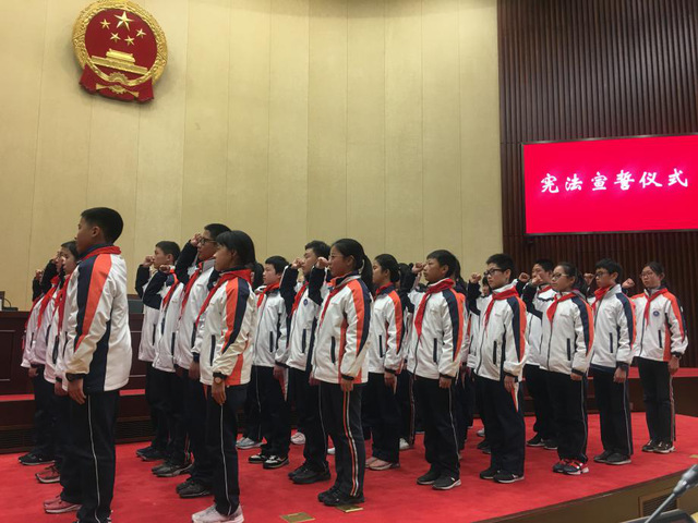 随后,同学们来到了省人大常委会会议厅,聆听了江苏省人大常委会赵建阳副秘书长对开放日活动的致辞;观看了《国家主席就职宣誓》专题片;参加了江苏省第十三届人民代表大会法制委员会王腊生主任委员的深入浅出的宪法大讲堂;由班主任李嘉琳老师上台模拟作关于“人事任免案”的说明,全班同学也亲自经历了投票表决环节,郑重地投出了一票;进行庄重的“小小宪法宣传员”宣誓活动,收获颇丰。