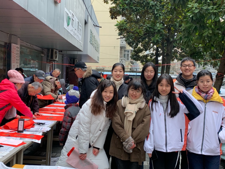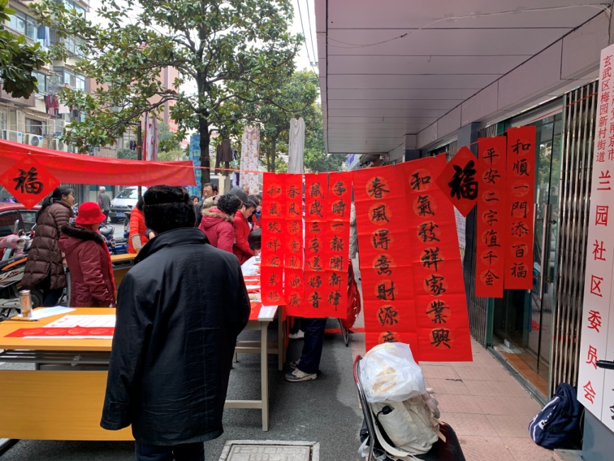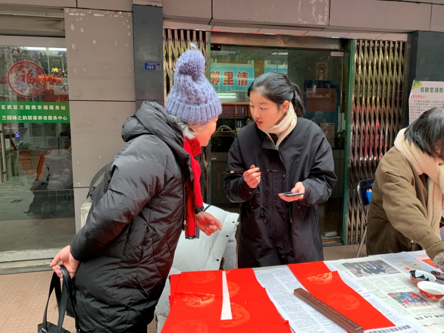 “千门万户曈曈日,总把新桃换旧符。”春节将至,南外书法社部分同学于1月17日下午来到兰园社区,为社区居民现场写春联、送福字。