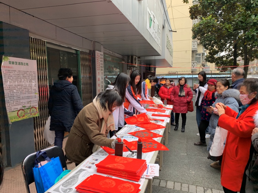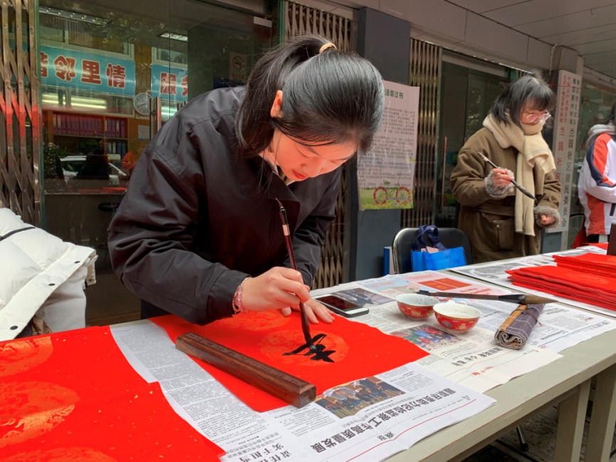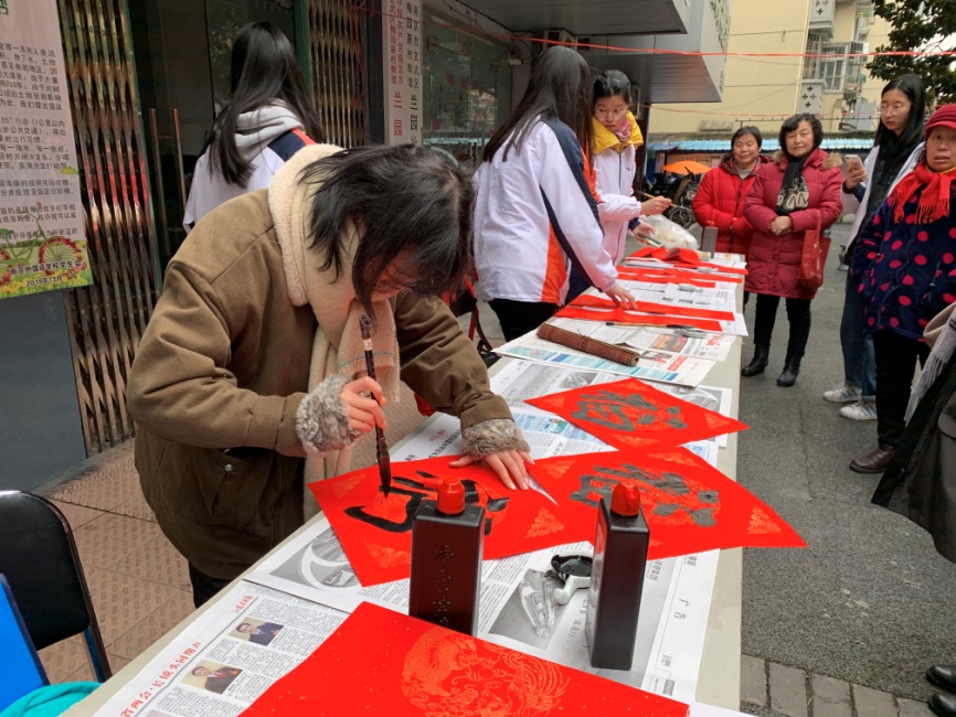 同学们不畏严寒,挥毫泼墨,很快就有居民被吸引过来。居民们对着春联、福字,连连夸赞已经感觉到浓浓的年味,围观的居民越来越多,现场气氛逐渐热烈起来。