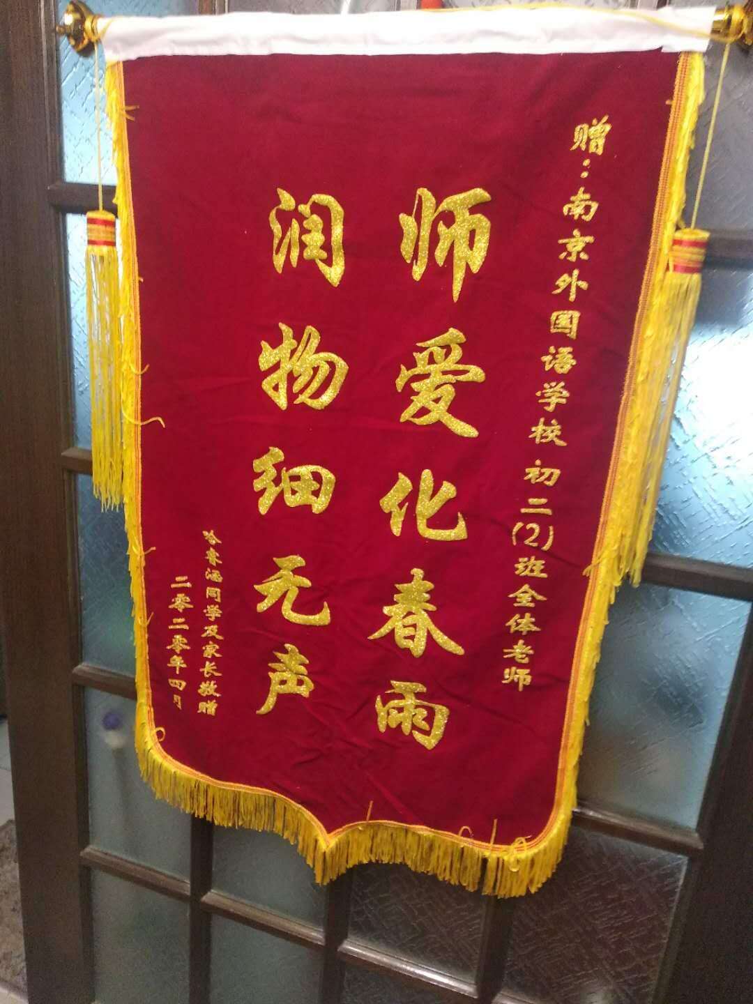 圆满完成援鄂任务的哈睿涵同学家长,在回到南京后了解到这一个月来自己孩子的学习生活情况,很是感动,专门将一面锦旗和一份感谢信送到了初二年级老师的手上。