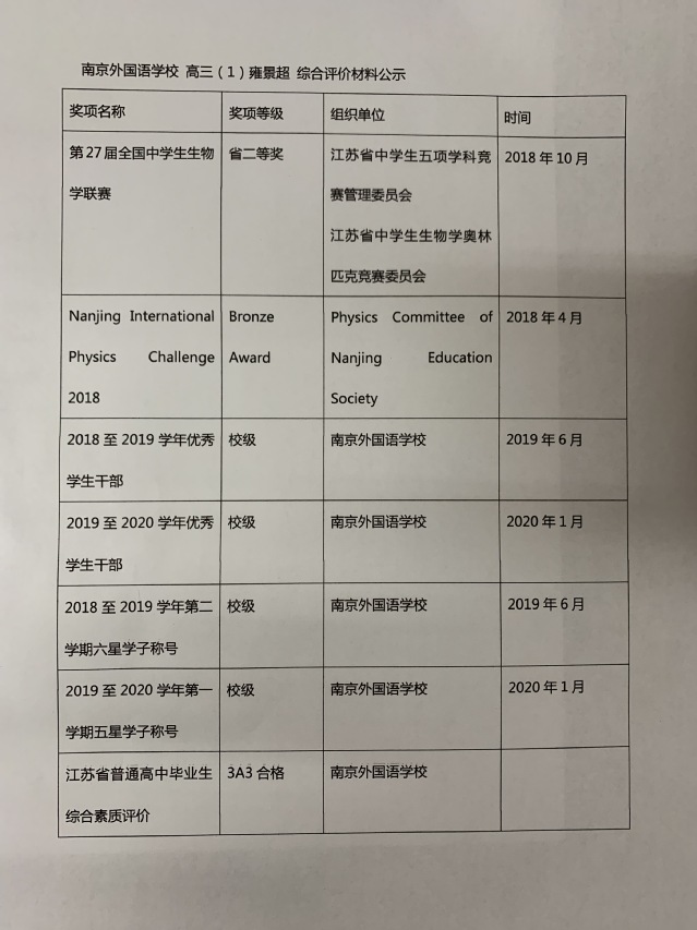 3.经本人申请,现将综合评价获奖情况申报材料公示如下: