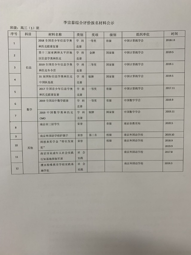3.经本人申请,现将综合评价获奖情况申报材料公示如下: