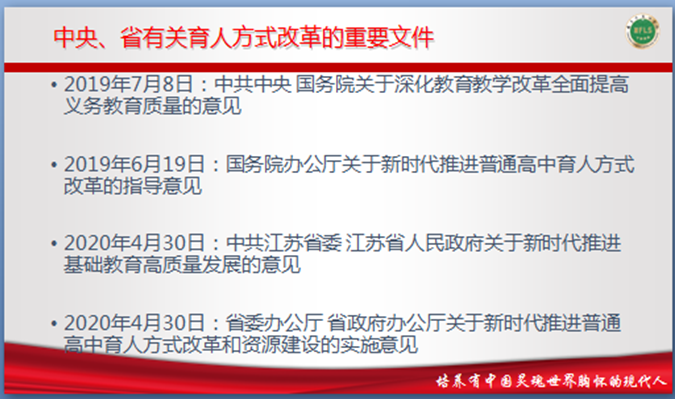 刘书记指出,普通高中教育是国民教育体系的重要组成部分,在人才培养中起着承上启下的关键作用,一系列指导意见的出台,对于办好普通高中教育,增强高中教育发展后劲,提高国民整体素质将产生重要影响。作为江苏省首批高品质示范高中立项学校,要充分学习文件精神,并做好贯彻落实。