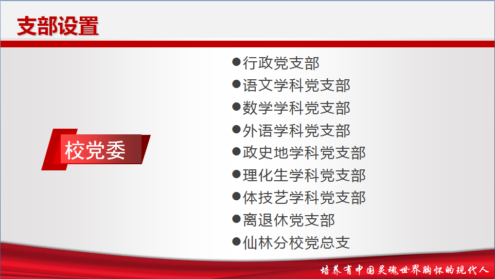 南外党委始终不忘为国育才的初心,坚持社会主义办学方向,全面贯彻党的教育方针,强化学生的家国情怀和全球视野,鼓励学生全面发展、自由成长,努力成为社会主义事业的建设者和接班人。党的十九大以来,南外进一步发挥党组织的政治核心和战斗堡垒作用,以“大党建”理念全面推动学校高质量发展,以高品质党建引领学校文化建设,着力打造 “有文化之根、有育人之魂、有高远之品、有务实之为”的党建文化,践行“铸魂·筑梦”行动。在南外深化教育教学改革、创建具有中国特色的世界名校的过程中,校党委将一如既往发挥核心作用,用“大党建”工作格局推动学校事业发展,凝神聚力,把南外建成具有中国特色的高品质世界名校。