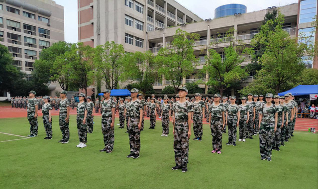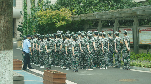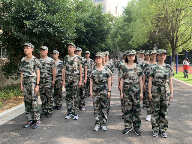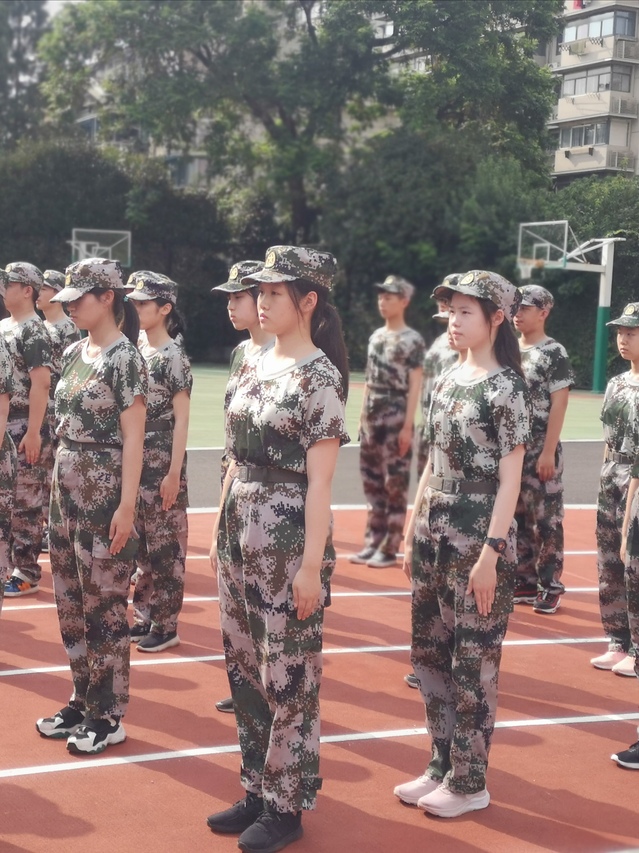 远远得,就能看见一团一团的墨绿在上下浮动。穿上迷彩军训服的同学在早上都格外活泼,或许是已经适应了军训强度,又或是为充满少年朝气的自己感到骄傲,所有人眼里都放出光,显出勃勃生机。