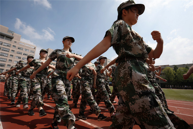 澄澈湛蓝的天空下,操场上竖立得满是迷彩服,小小的面庞抬起闪着自信坚毅的光芒,滚烫的阳光在身上跳跃,晶莹的汗水在脸上流淌。