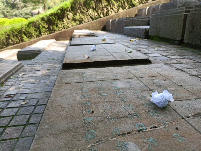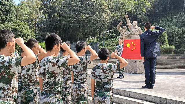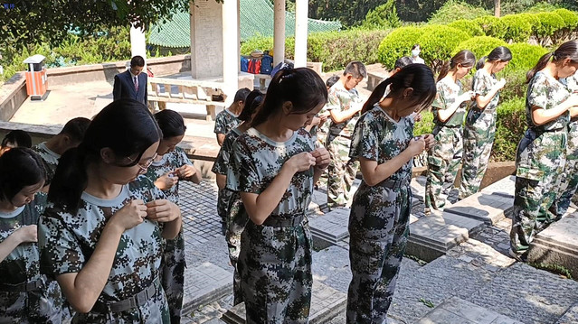 离开场馆,我们走向山头的另一侧参加宣誓仪式和祭奠仪式。太阳从云层中跳出来,放出炽热的光线,身旁的石子上满是光怪陆离的斑影。顶着烈阳,我们拾级而上,在前国旗班班长的带领下。我们庄严宣誓“以我火热青春,谱写国旗礼赞,用我生命热忱,捍卫国旗尊严尊严,宣誓人——”即使平时内向的同学在此刻都声如洪钟,喊出内心的声音和与国旗许下的神圣契约。国旗和校旗列于队手,被风吹起,鼓鼓的,紧绷着,好像这片华夏土地上人民的勇敢,好像烈士们奋不顾身的勇敢。