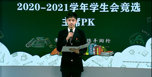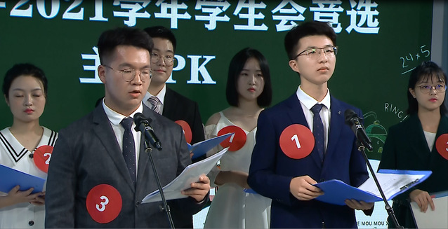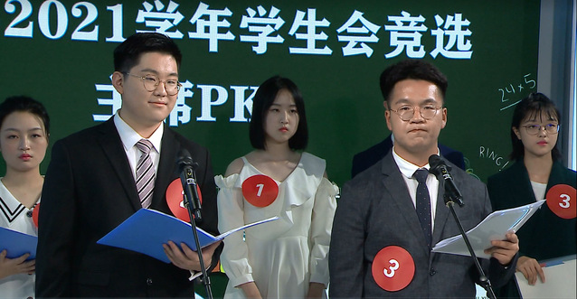 现在将进行主席PK,主席候选人们也将用自己的方式向同学们证明自己的实力。本次主席PK共分为阐述和答辩两个环节,分别都有时间限制,改委会委员同学将负责计时,在倒计时5秒时,计时同学会举手示意,请候选人不要超时。