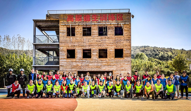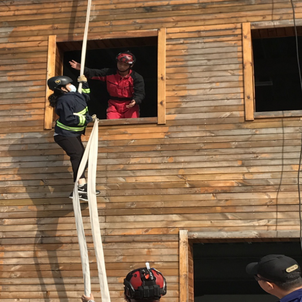 当天下午,我们就迎来了最“刺激”的项目——高层逃生课程。望着三层木质小楼,很多老师都流露出的畏惧情绪。教官当即问及有无老师有恐高,很多老师都举起了手,教官接着追问:“这是医院诊断结果吗?”,“你的症状是怎样的?”。一番对话下来,教官微笑着说:“大家表达的都是害怕,而不是恐高。今天的训练就是帮大家克服害怕的极好机会。”随后在教官的耐心讲解和热情鼓励下,三位男老师率先完成了消防水带下降,女老师们也陆续跟上。beat365李炜老师一马当先,戴上防护手套,走上二楼,极为标准地完成了消防水带下降。此后的绳索下降和软梯下降,大家都更为顺利地完成了。与此同时,教官还教授了我们一些基础绳结,如八字结、蛇口结、防脱节。