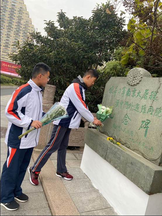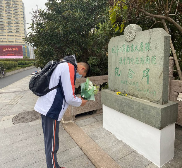 四、丛葬地祭扫进行缅怀悼念。部分同学自发前往丛葬地开展缅怀悼念活动,通过向遇难同胞默哀、献花的方式进行缅怀悼念。
