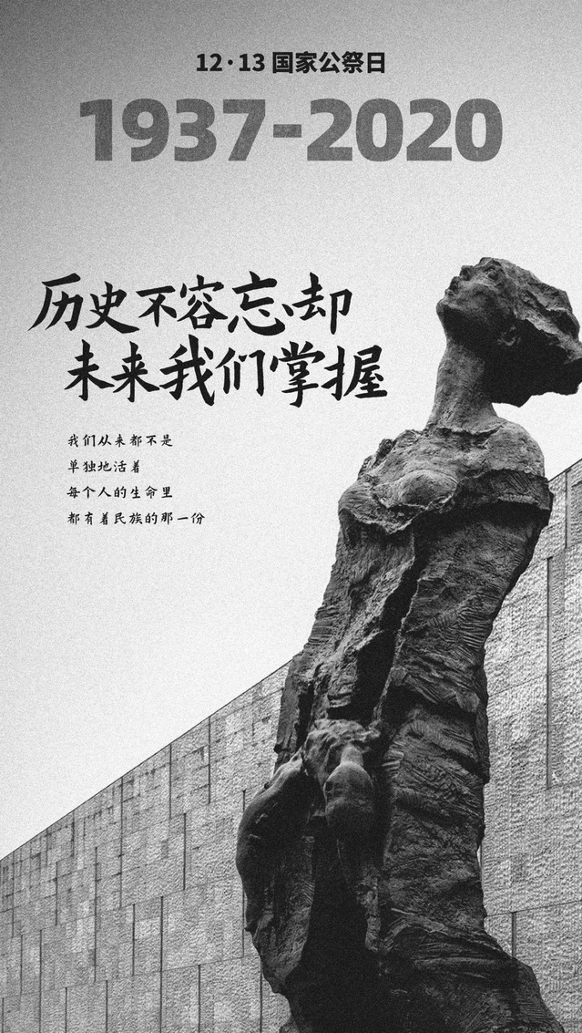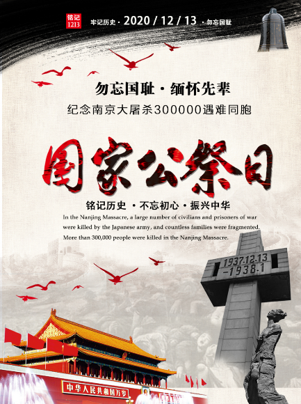 2020年12月13日是新中国成立后的第七个国家公祭日。根据团市委国家公祭日系列教育活动通知要求,校团委组织高一支部开展缅怀悼念活动。本次国家公祭日教育活动主题为“勿忘国耻、圆梦中华”,活动内容为:“勿忘国耻、圆梦中华”主题团课、国家公祭日公益海报设计、珍爱和平三行诗征集、国家公祭日丛葬地祭扫活动和网上纪念活动。全体高一团支部按要求开展各种形式的活动,引导南外学子牢记历史、珍爱和平、开创未来。