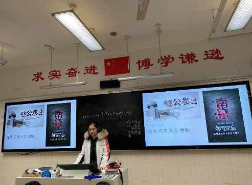 高一(4)班团支书王玺程在总结中说道:团课最后,同学们集体起立,为在南京大屠杀中死难的同胞默哀一分钟。这一分钟别具意义,它既是对过去伤痛的缅怀与记忆,又是对未来和平的展望与期待。愿世界和平发展,人类共同兴旺繁荣,正如《国际歌》中所唱:“英特纳雄耐尔,就一定要实现!”