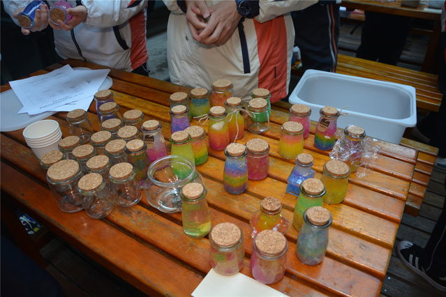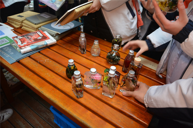长廊里展现的则是另一番义卖景象,各社团竞相拿出自己的绝活吸引顾客。手绘社展示精美的画作,天文社出售绚丽的星空瓶,爱乐社更是当场献唱。爱心随着音符跳动,活动也在声浪中被推向高潮。