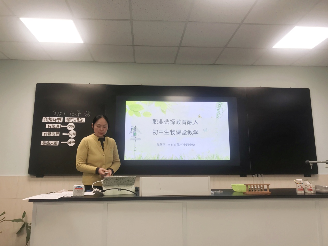 两节研究课后,南京市第五十四中学的曾秋丽老师做了题为《职业选择教育融入初中生物课堂教学》的讲座。曾老师从了解生命科学发展,培育职业信念(价值取向);关注社会热点问题,探寻职业方向(社会需求);开展职业采访活动,拓宽职业视野(职业认知)和参与角色扮演活动,激发职业兴趣(自我认知)四个方面给大家介绍了如何把职业选择教育融入初中生物课堂中。讲座内容引用许多生活案例和影视资料,通俗易懂又发人深思。