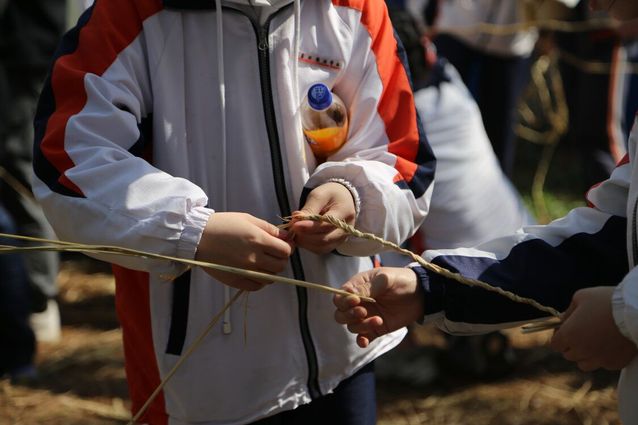 大家学习了搓草绳,了解到了草绳在当今农业生产中依然不可或缺的重要作用。基地的老师耐心地给大家示范,同学们在小组协作中完成了任务,增进了同窗友谊,粗糙而易断的稻草在同学们们手上也多姿多彩起来。