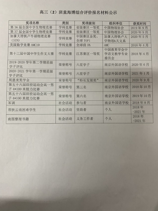 3.经本人申请,现将综合评价获奖情况申报材料公示如下: