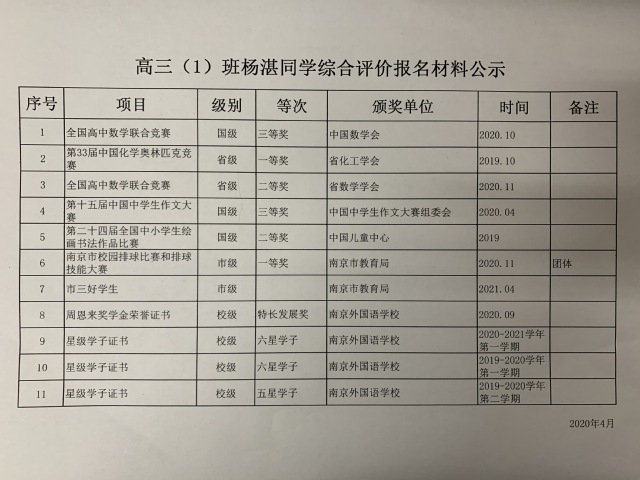 3.经本人申请,现将综合评价获奖情况申报材料公示如下: