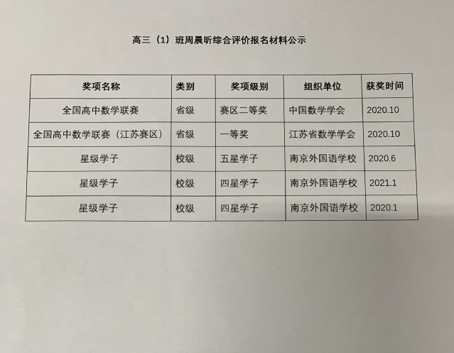 3.经本人申请,现将综合评价获奖情况申报材料公示如下: