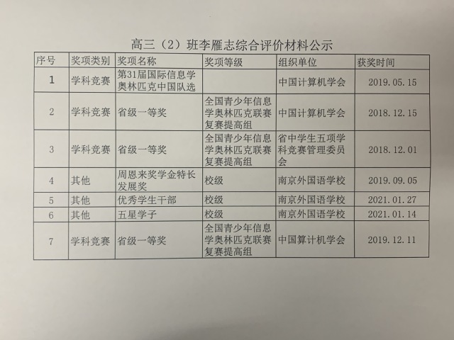3.经本人申请,现将综合评价获奖情况申报材料公示如下: