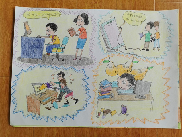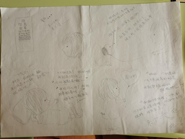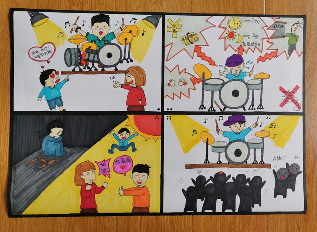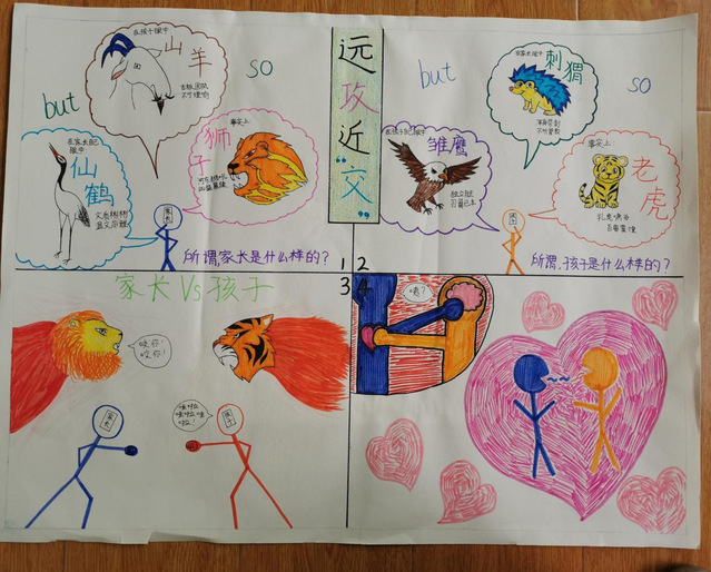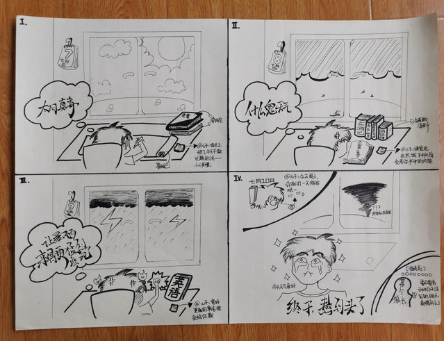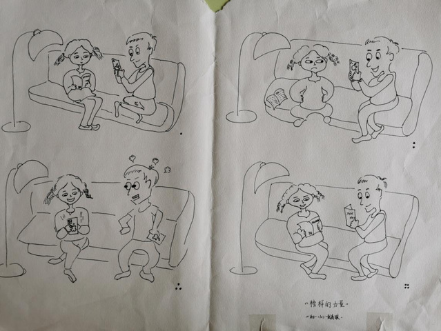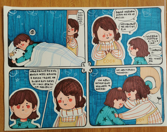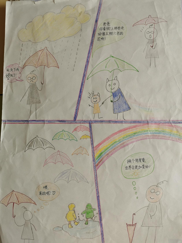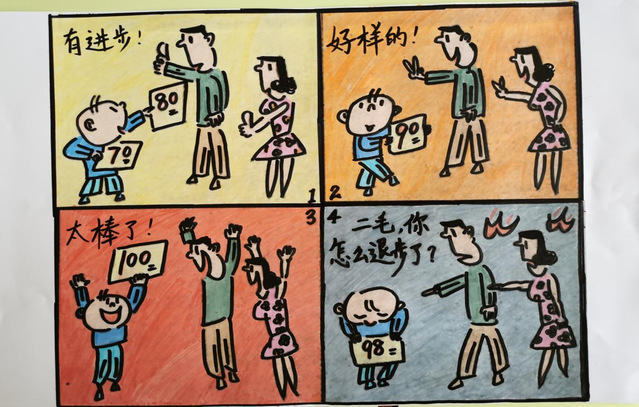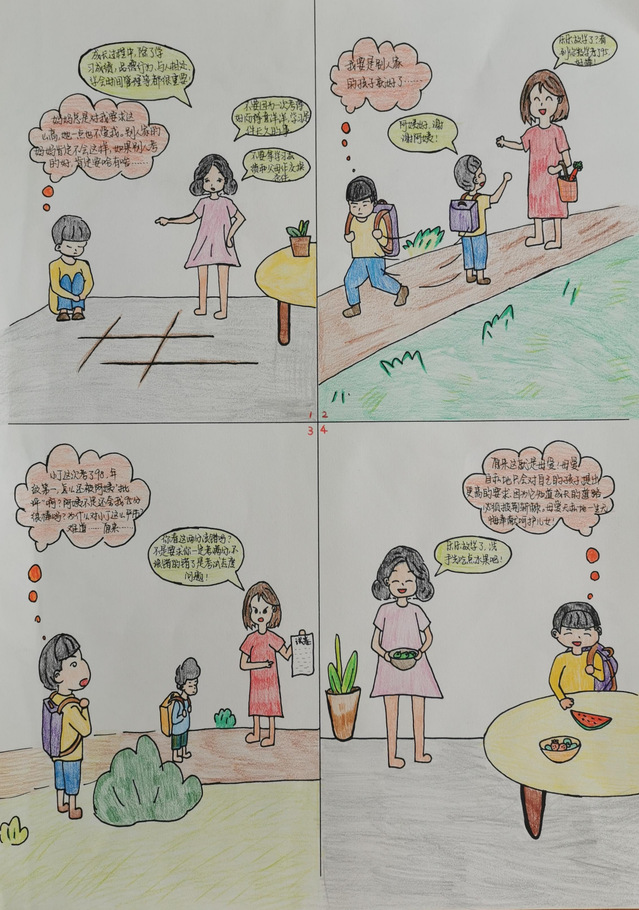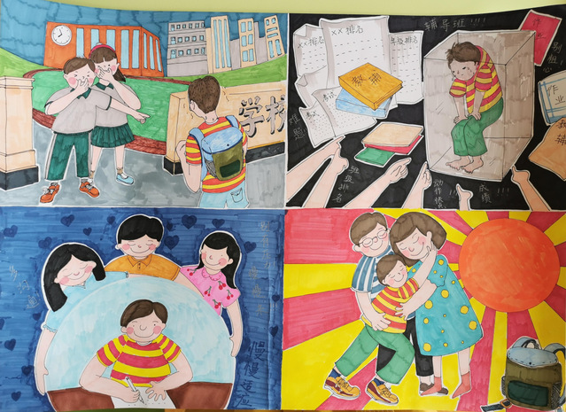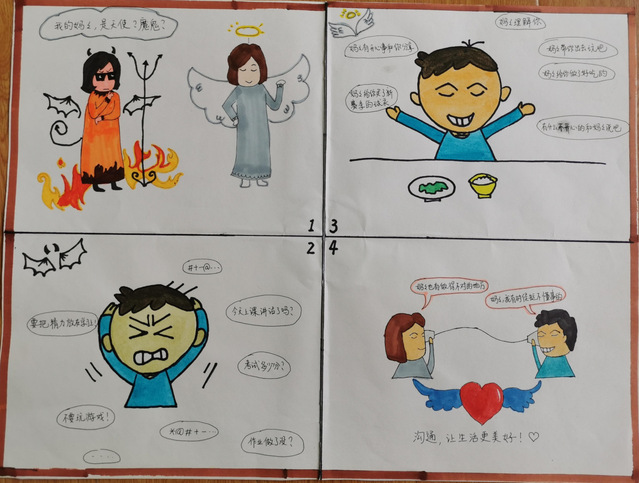 在本次比赛收到的画稿中,许多学生用画吐露自己“成长的烦恼”,在小小的四格漫画中诉说在家校合作、亲子沟通等诸多方面经历的困惑,用斑斓色彩描画当时体会到的情绪,用各异线条清晰呈现自己应对的方法。学生们的作品打动人的既是他们在美术与设计方面的巧思,更是他们在画幅中对于自己内心的勇敢剖析与分享。让我们一起来欣赏部分获奖学生的优秀作品: