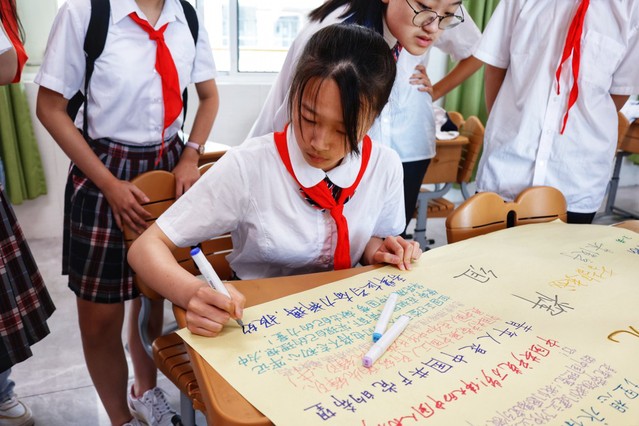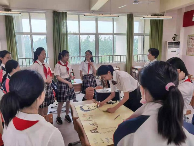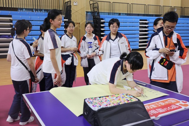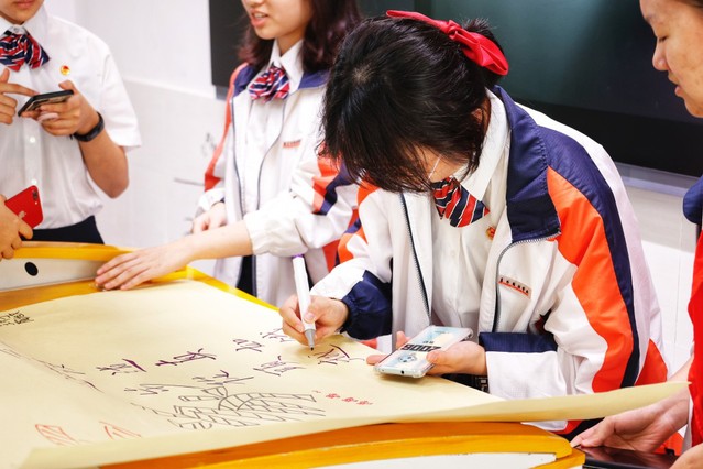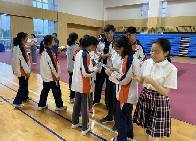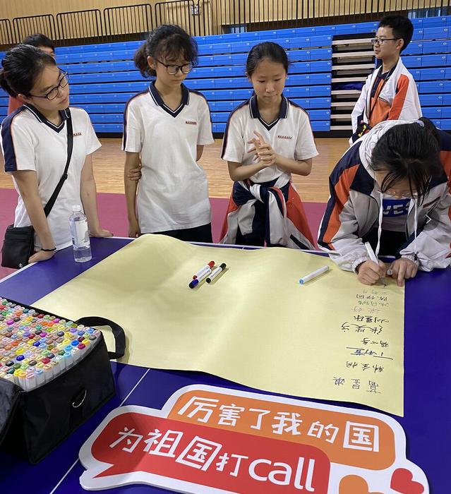 第一项任务是“找队友”。同学们根据抽到的歌词,需要找到对应的歌名所代表的队伍,看哪个组最先集合齐所有的队员,获胜的小队赢得了一块写有“厉害了我的国 我为祖国打call”的荣誉板。