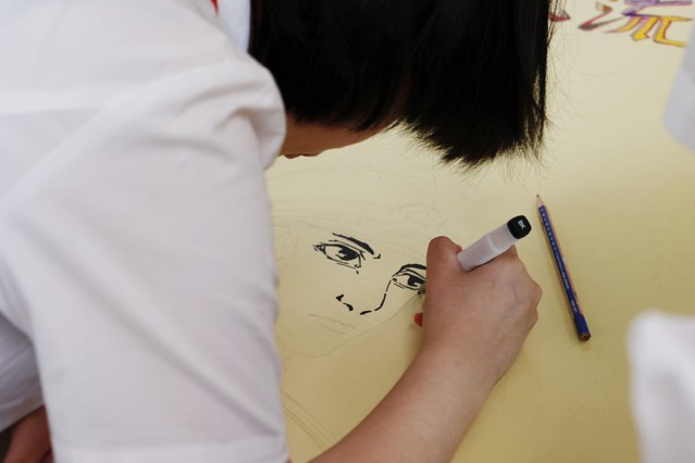 将本部三个年级同学和分校的同学平均分成四组,老师们决定用抽签的方式。原本以为抽签的纸上就写着几队,拿到手后才发现是一句歌词。带队老师举着歌名站在前面,我由于不熟,束手无策的站在原地。终于有同学发现了规律——同一个队的字体是一样的。可是在场的大多数都是不认识的同学,有些不好意思问,后来被形势所迫,我开口向别的同学询问字体。最终,找到了自己的队伍。归队后才发现,交际就在不知不觉间发生了,好像也不是很难。分配的第一个任务就是取队名,高中的学姐果断的选择了“红队”,既简单大气,又凸显党成立100周年的大主题。